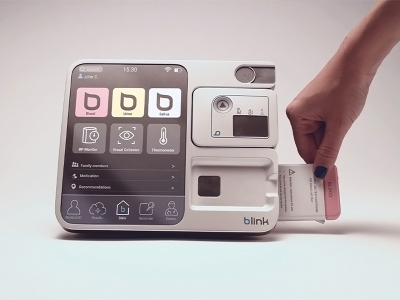 Blink是受我们当前状况影响的设计师创建的智能医疗设备。它结构紧凑,专为在家中使用而设计,可以执行基本的医学检查并报告您的生命体征。指导用户逐步测量血压,体温,甚至进行基本的血液,尿液和唾液测试。Blink收集数据并将其报告发送反馈给医生,这不仅降低了传播风险(尤其是在大流行中),而且还可以使人放心,避免因过度思考而引起的焦虑。